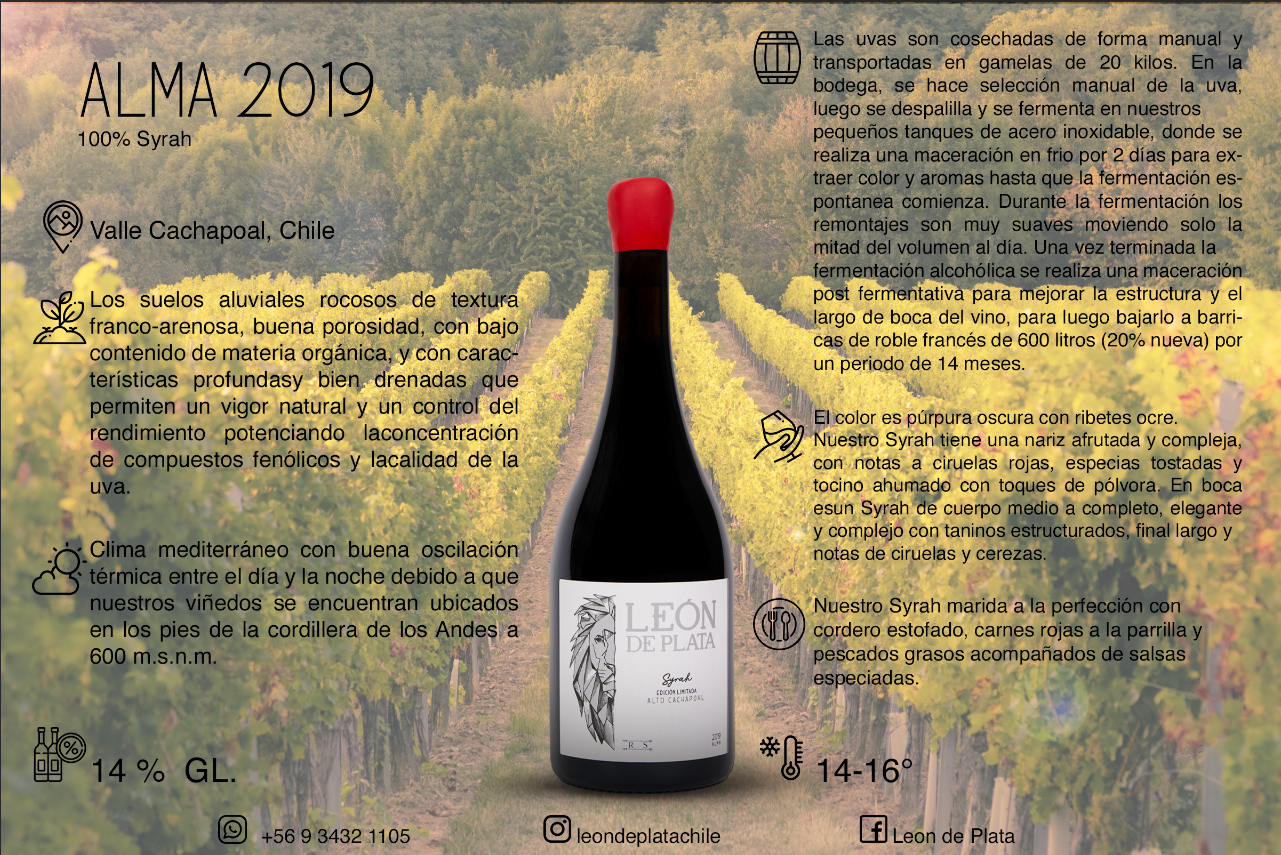 ALMA 2019 es un Syrah sofisticado del Valle Cachapoal, elaborado de manera artesanal con uvas seleccionadas a mano. Presenta aromas complejos a ciruelas rojas, especias y suaves notas ahumadas, con una boca elegante y estructurada. Ideal para acompañar carnes rojas, cordero estofado y pescados grasos. Disfrútalo entre 14-16°C para potenciar todo su carácter.
