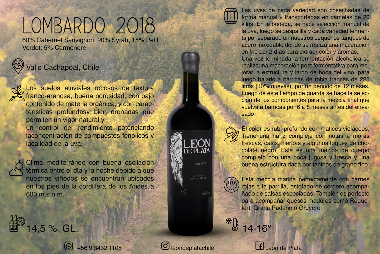 LOMBARDO 2018 es un exclusivo blend del Valle Cachapoal (Cabernet Sauvignon, Syrah, Petit Verdot y Carmenere), de perfil jugoso y con buena estructura. Destacan sus aromas a frutas frescas, hierbas y sutiles notas de chocolate negro, ideal para carnes rojas, cordero y quesos maduros. Disfrútalo entre 14-16°C y vive toda su elegancia.